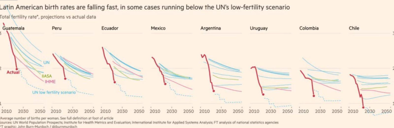 These are the birth rates for a few Latam countries. The blue lines are the UN projections, and the red is the oh-all-to-real smack-in-your-face reality. They are plummeting and no one seems to want to acknowledge it.