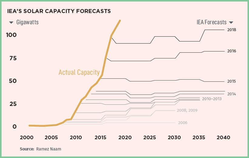 Every single year, straight in the face of evidence, the IEA has projected a flattening of the curve of installed solar production capacity. And every single year, without fail, actual deployed solar capacity goes vertical.